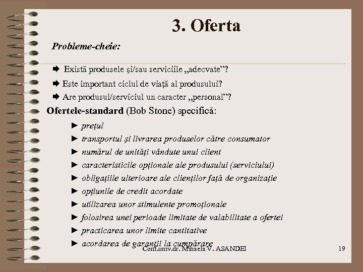 Probleme-cheie: 3. Oferta Există produsele şi/sau serviciile „adecvate”? Este important ciclul de viaţă al produsului? Are produsul/serviciul un caracter „personal”? Ofertele-standard (Bob Stone) specifică: ► preţul ► transportul şi livrarea produselor către consumator ► numărul de unităţi vândute unui client ► caracteristicile opţionale produsului (serviciului) ► obligaţiile ulterioare ale clienţilor faţă de organizaţie ► opţiunile de credit acordate ► utilizarea unor stimulente promoţionale ► folosirea unei perioade limitate de valabilitate a ofertei ► practicarea unor limite cantitative ► acordarea de garanţii la cumpărare Conf. univ. dr. Mihaela V. ASANDEI 19