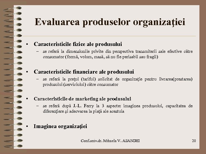 Evaluarea produselor organizaţiei • Caracteristicile fizice ale produsului – se referă la dimensiunile privite din perspectiva transmiterii sale efective către consumator (formă, volum, masă, să nu fie perisabil sau fragil) • Caracteristicile financiare ale produsului – se referă la preţul (tariful) solicitat de organizaţie pentru livrarea(prestarea) produsului (serviciului) către consumator • Caracteristicile de marketing ale produsului – se referă după J. -L. Ferry la 3 aspecte: imaginea produsului, capacitatea de diferenţiere şi adecvarea la piaţă ale acestuia • Imaginea organizaţiei Conf. univ. dr. Mihaela V. ASANDEI 20