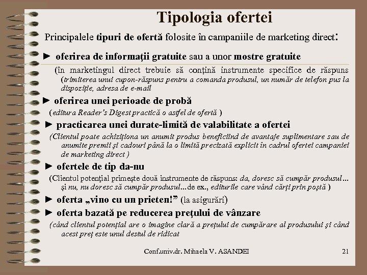 Tipologia ofertei (2) ► opţiunea negativă - presupune desfăşurarea a 3 faze distincte: recrutarea aderenţilor (consumatorii interesaţi de ofertă sunt stimulaţi, prin prime sau a unor cadouri de recrutare consistente, să cumpere la intervale regulate un anumit produs), obligarea să cumpere într-o perioadă determinată a unui anumit număr de produse, la expirarea perioadei, aceştia au posibilitatea să opteze negativ pentru rezilierea contractului sau să continue trecând în a treia etapă şi având parte astfel de avantaje suplimentare. ► opţiunea pozitivă se aplică pe aceleaşi principii ca şi opţiunea negativă, inclusiv pe trei faze, însă pentru a primi (cumpăra) produsul, consumatorul trebuie să-l comande în mod expres. ► oferta de participare la concursuri ► oferta de tip club (ex. , Club Capital) ► oferta de tip „load-up” este o formulă preferată de editorii seriilor continue, pentru vânzarea unui număr cât mai mare de serii complete. De ex. , editura Prietenii cărţii. ► oferirea de cadouri clienţilor organizaţiei ► oferta de tip „add-on” (modalitate de ofertare folosită în situaţia în care organizaţia intenţionează să promoveze şi să comercializeze şi alte produse în afara celui care a făcut deja obiectul campaniei de marketing direct ) ► oferta multiprodus – asemănător vânzării grupate Conf. univ. dr. Mihaela V. ASANDEI 22