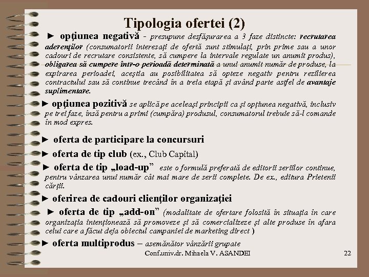 Tipologia ofertei Principalele tipuri de ofertă folosite în campaniile de marketing direct: ► oferirea de informaţii gratuite sau a unor mostre gratuite (în marketingul direct trebuie să conţină instrumente specifice de răspuns (trimiterea unui cupon-răspuns pentru a comanda produsul, un număr de telefon pus la dispoziţie, adresa de e-mail ► oferirea unei perioade de probă (editura Reader’s Digest practică o astfel de ofertă ) ► practicarea unei durate-limită de valabilitate a ofertei (Clientul poate achiziţiona un anumit produs beneficiind de avantaje suplimentare sau de anumite premii şi cadouri până la o limită precizată explicit în cadrul ofertei campaniei de marketing direct ) ► ofertele de tip da-nu (Clientul potenţial primeşte două instrumente de răspuns: da, doresc să cumpăr produsul… şi nu, nu doresc să cumpăr produsul…de ex. , editurile care vând cărţi prin poştă ) ► oferta „vino cu un prieten!” (la asigurări) ► oferta bazată pe reducerea preţului de vânzare (când clientul potenţial are o imagine clară a preţului de cumpărare al produsului şi când acest preţ este unul destul de ridicat Conf. univ. dr. Mihaela V. ASANDEI 21