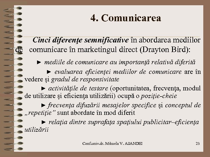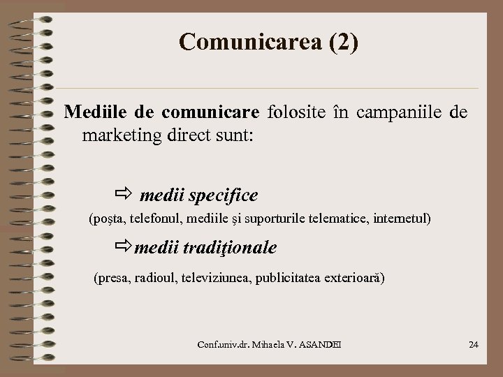 4. Comunicarea Cinci diferenţe semnificative în abordarea mediilor de comunicare în marketingul direct (Drayton Bird): ► mediile de comunicare au importanţă relativă diferită ► evaluarea eficienţei mediilor de comunicare în vedere şi gradul de responsivitate ► activităţile de testare (oportunitatea, frecvenţa, modul de utilizare şi eficienţa utilizării) ocupă o poziţie-cheie ► frecvenţa difuzării mesajelor specifice şi conceptul de „repetiţie” sunt abordate în mod diferit ► relaţia dintre suprafaţa spaţiului publicitar–eficienţa utilizării Conf. univ. dr. Mihaela V. ASANDEI 23