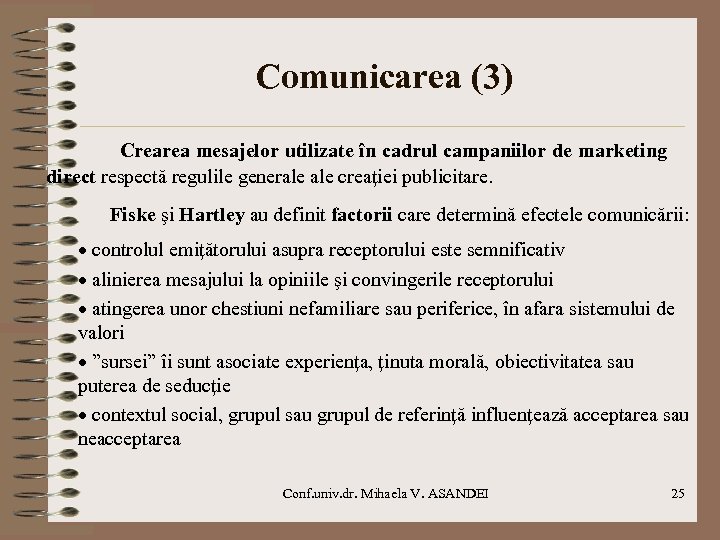 Comunicarea (3) Crearea mesajelor utilizate în cadrul campaniilor de marketing direct respectă regulile generale creaţiei publicitare. Fiske şi Hartley au definit factorii care determină efectele comunicării: · controlul emiţătorului asupra receptorului este semnificativ · alinierea mesajului la opiniile şi convingerile receptorului · atingerea unor chestiuni nefamiliare sau periferice, în afara sistemului de valori · ”sursei” îi sunt asociate experienţa, ţinuta morală, obiectivitatea sau puterea de seducţie · contextul social, grupul sau grupul de referinţă influenţează acceptarea sau neacceptarea Conf. univ. dr. Mihaela V. ASANDEI 25