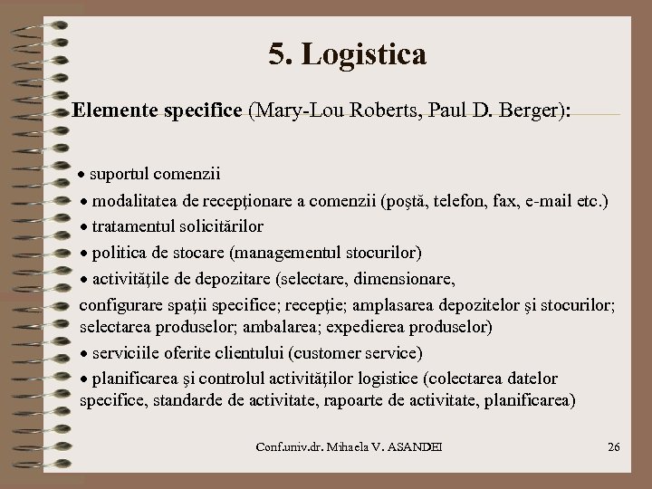 5. Logistica Elemente specifice (Mary-Lou Roberts, Paul D. Berger): · suportul comenzii · modalitatea de recepţionare a comenzii (poştă, telefon, fax, e-mail etc. ) · tratamentul solicitărilor · politica de stocare (managementul stocurilor) · activităţile de depozitare (selectare, dimensionare, configurare spaţii specifice; recepţie; amplasarea depozitelor şi stocurilor; selectarea produselor; ambalarea; expedierea produselor) · serviciile oferite clientului (customer service) · planificarea şi controlul activităţilor logistice (colectarea datelor specifice, standarde de activitate, rapoarte de activitate, planificarea) Conf. univ. dr. Mihaela V. ASANDEI 26
