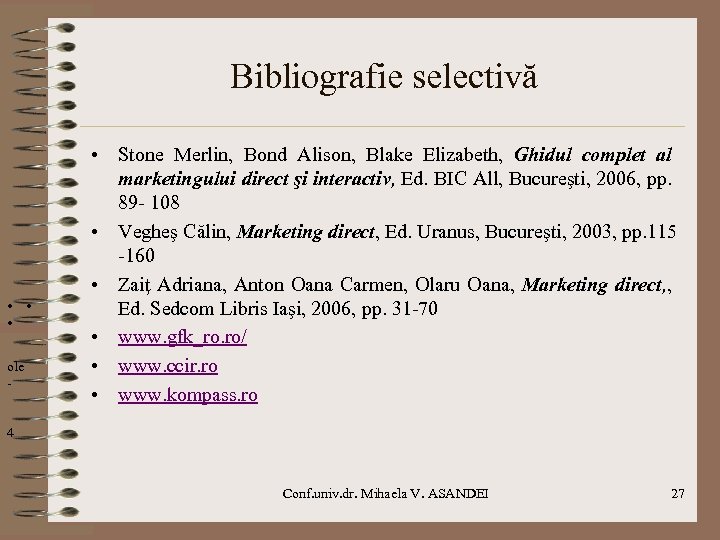 Bibliografie selectivă ole - • Stone Merlin, Bond Alison, Blake Elizabeth, Ghidul complet al marketingului direct şi interactiv, Ed. BIC All, Bucureşti, 2006, pp. 89 - 108 • Vegheş Călin, Marketing direct, Ed. Uranus, Bucureşti, 2003, pp. 115 -160 • Zaiţ Adriana, Anton Oana Carmen, Olaru Oana, Marketing direct, , Ed. Sedcom Libris Iaşi, 2006, pp. 31 -70 • www. gfk_ro. ro/ • www. ccir. ro • www. kompass. ro 4 Conf. univ. dr. Mihaela V. ASANDEI 27