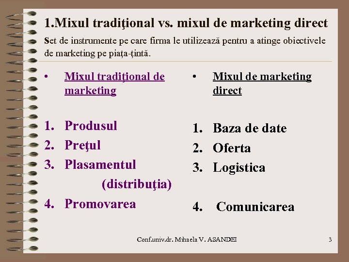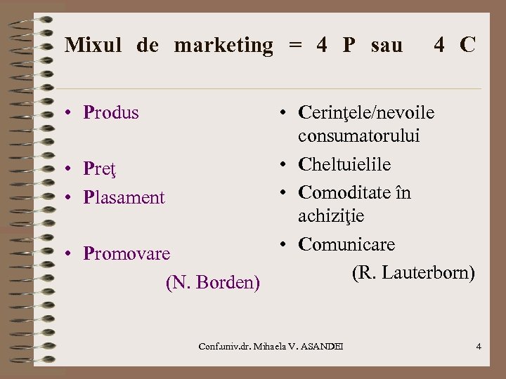 1. Mixul tradiţional vs. mixul de marketing direct set de instrumente pe care firma le utilizează pentru a atinge obiectivele de marketing pe piaţa-ţintă. • Mixul tradiţional de marketing 1. Produsul 2. Preţul 3. Plasamentul (distribuţia) 4. Promovarea • Mixul de marketing direct 1. Baza de date 2. Oferta 3. Logistica 4. Comunicarea Conf. univ. dr. Mihaela V. ASANDEI 3