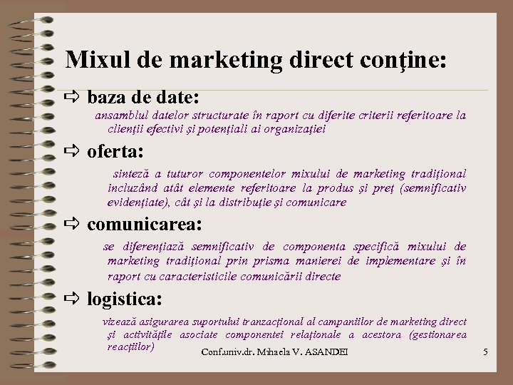 Mixul de marketing direct conţine: baza de date: ansamblul datelor structurate în raport cu diferite criterii referitoare la clienţii efectivi şi potenţiali ai organizaţiei oferta: sinteză a tuturor componentelor mixului de marketing tradiţional incluzând atât elemente referitoare la produs şi preţ (semnificativ evidenţiate), cât şi la distribuţie şi comunicarea: se diferenţiază semnificativ de componenta specifică mixului de marketing tradiţional prin prisma manierei de implementare şi în raport cu caracteristicile comunicării directe logistica: vizează asigurarea suportului tranzacţional al campaniilor de marketing direct şi activităţile asociate componentei relaţionale a acestora (gestionarea reacţiilor) Conf. univ. dr. Mihaela V. ASANDEI 5
