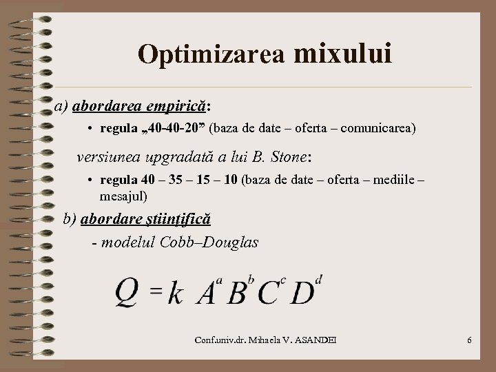 Optimizarea mixului a) abordarea empirică: • regula „ 40 -40 -20” (baza de date – oferta – comunicarea) versiunea upgradată a lui B. Stone: • regula 40 – 35 – 10 (baza de date – oferta – mediile – mesajul) b) abordare ştiinţifică - modelul Cobb–Douglas Conf. univ. dr. Mihaela V. ASANDEI 6