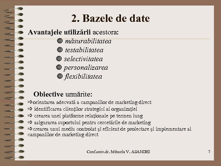 2. Bazele de date Avantajele utilizării acestora: măsurabilitatea testabilitatea selectivitatea personalizarea flexibilitatea Obiective urmărite: orientarea adecvată a campaniilor de marketing direct identificarea clienţilor strategici ai organizaţiei crearea unei platforme relaţionale pe termen lung asigurarea suportului pentru cercetările de marketing crearea unui mediu controlat şi eficient de proiectare şi implementare al campaniilor de marketing direct Conf. univ. dr. Mihaela V. ASANDEI 7