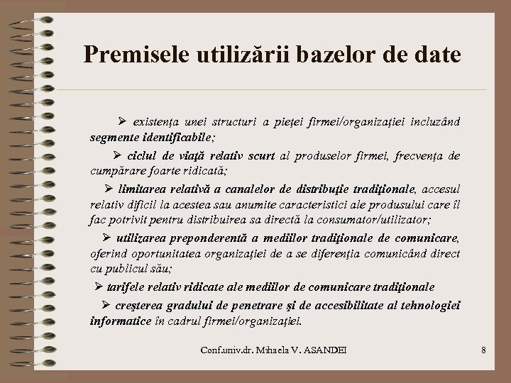 Premisele utilizării bazelor de date existenţa unei structuri a pieţei firmei/organizaţiei incluzând segmente identificabile; ciclul de viaţă relativ scurt al produselor firmei, frecvenţa de cumpărare foarte ridicată; limitarea relativă a canalelor de distribuţie tradiţionale, accesul relativ dificil la acestea sau anumite caracteristici ale produsului care îl fac potrivit pentru distribuirea sa directă la consumator/utilizator; utilizarea preponderentă a mediilor tradiţionale de comunicare, oferind oportunitatea organizaţiei de a se diferenţia comunicând direct cu publicul său; tarifele relativ ridicate ale mediilor de comunicare tradiţionale creşterea gradului de penetrare şi de accesibilitate al tehnologiei informatice în cadrul firmei/organizaţiei. Conf. univ. dr. Mihaela V. ASANDEI 8