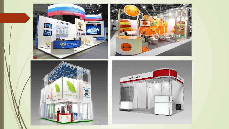 Функциональные зоны стенда Информационная зона. Предназначена для предоставления первичной информации и привлечения внимания посетителей. Презентационная зона. Предназначена для представления товаров или услуг и осуществления первичных контактов персонала с посетителями. Переговорная зона. Предназначена для проведения переговоров с посетителями. Подсобное помещение. Предназначено исключительно для персонала. В нем могут проводиться внутренние совещания и располагаться склад, гардероб, кухня, зона отдыха