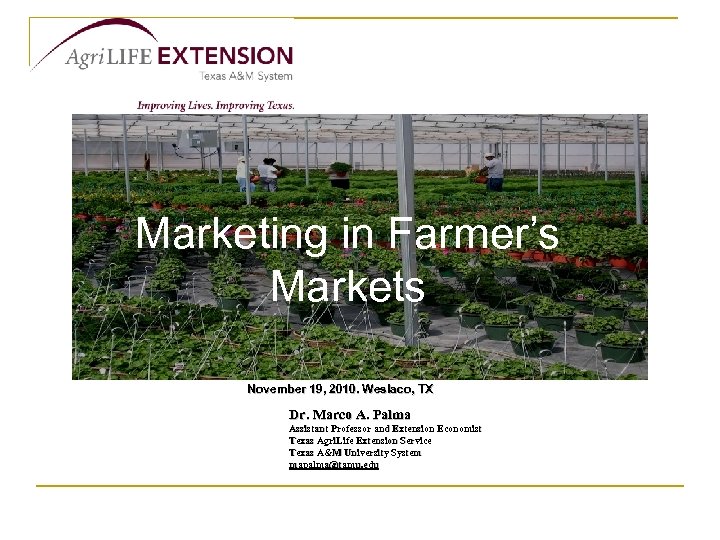 Marketing in Farmer’s Markets November 19, 2010. Weslaco, TX Dr. Marco A. Palma Assistant Professor and Extension Economist Texas Agri. Life Extension Service Texas A&M University System mapalma@tamu. edu