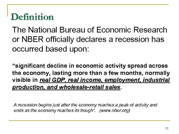 Definition The National Bureau of Economic Research or NBER officially declares a recession has occurred based upon: “significant decline in economic activity spread across the economy, lasting more than a few months, normally visible in real GDP, real income, employment, industrial production, and wholesale-retail sales A recession begins just after the economy reaches a peak of activity and ends as the economy reaches its trough”. (www. nber. org) 17