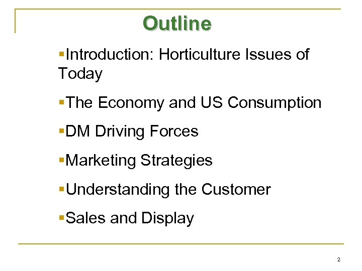 Outline §Introduction: Horticulture Issues of Today §The Economy and US Consumption §DM Driving Forces §Marketing Strategies §Understanding the Customer §Sales and Display 2