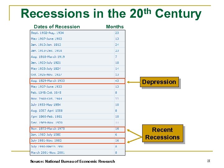 Recessions in the 20 th Century Dates of Recession Months Depression Recent Recessions Source: National Bureau of Economic Research 21