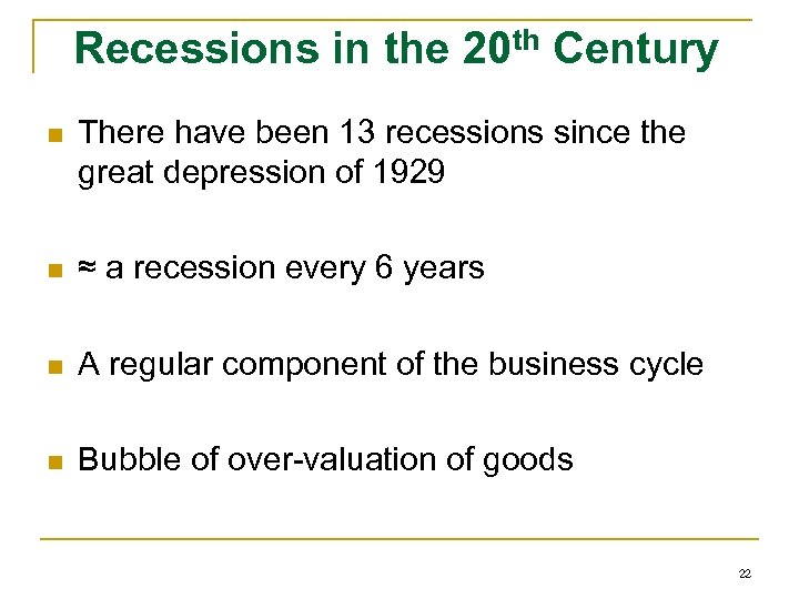 Recessions in the 20 th Century n There have been 13 recessions since the great depression of 1929 n ≈ a recession every 6 years n A regular component of the business cycle n Bubble of over-valuation of goods 22