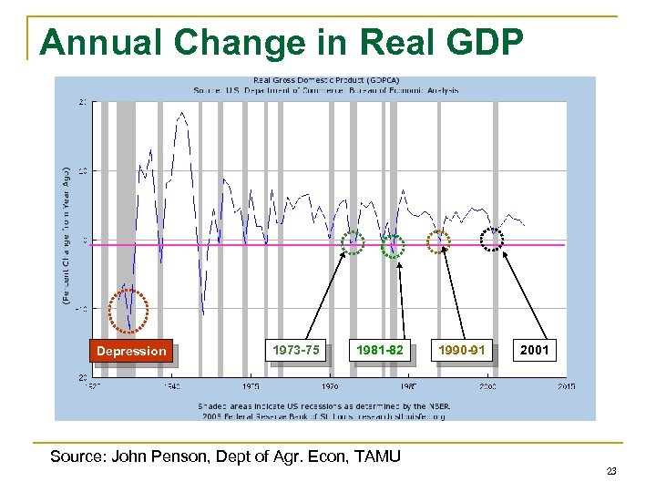 Annual Change in Real GDP Depression 1973 -75 1981 -82 Source: John Penson, Dept of Agr. Econ, TAMU 1990 -91 2001 23