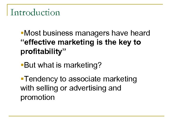 Introduction §Most business managers have heard “effective marketing is the key to profitability” §But what is marketing? §Tendency to associate marketing with selling or advertising and promotion