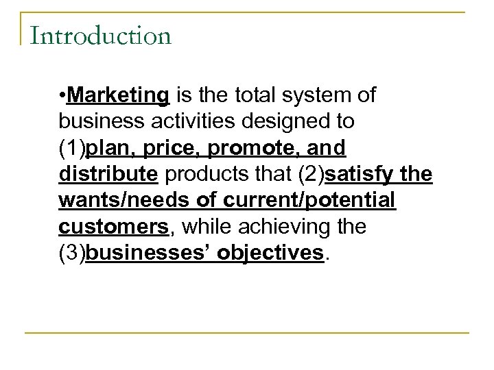 Introduction • Marketing is the total system of business activities designed to (1)plan, price, promote, and distribute products that (2)satisfy the wants/needs of current/potential customers, while achieving the (3)businesses’ objectives.