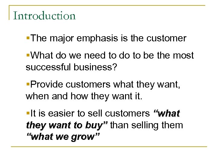 Introduction §The major emphasis is the customer §What do we need to do to be the most successful business? §Provide customers what they want, when and how they want it. §It is easier to sell customers “what they want to buy” than selling them “what we grow”