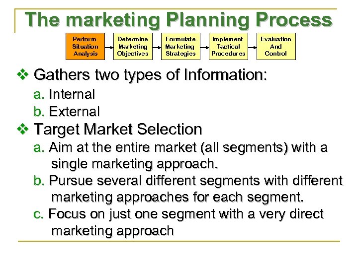 The marketing Planning Process Perform Situation Analysis Determine Marketing Objectives Formulate Marketing Strategies Implement Tactical Procedures Evaluation And Control v Gathers two types of Information: a. Internal b. External v Target Market Selection a. Aim at the entire market (all segments) with a single marketing approach. b. Pursue several different segments with different marketing approaches for each segment. c. Focus on just one segment with a very direct marketing approach