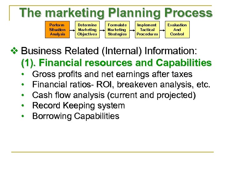 The marketing Planning Process Perform Situation Analysis Determine Marketing Objectives Formulate Marketing Strategies Implement Tactical Procedures Evaluation And Control v Business Related (Internal) Information: (1). Financial resources and Capabilities • • • Gross profits and net earnings after taxes Financial ratios- ROI, breakeven analysis, etc. Cash flow analysis (current and projected) Record Keeping system Borrowing Capabilities