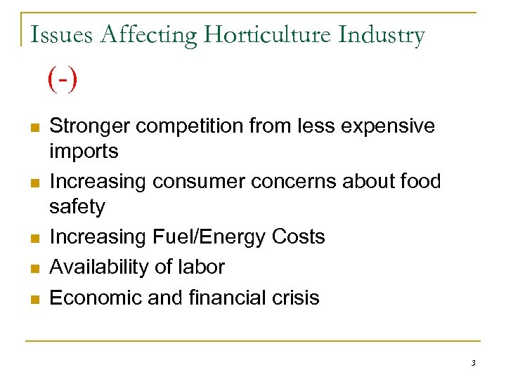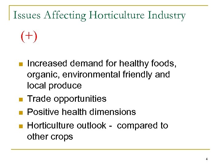 Issues Affecting Horticulture Industry (-) n n n Stronger competition from less expensive imports Increasing consumer concerns about food safety Increasing Fuel/Energy Costs Availability of labor Economic and financial crisis 3