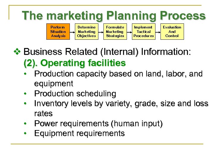The marketing Planning Process Perform Situation Analysis Determine Marketing Objectives Formulate Marketing Strategies Implement Tactical Procedures Evaluation And Control v Business Related (Internal) Information: (2). Operating facilities • Production capacity based on land, labor, and equipment • Production scheduling • Inventory levels by variety, grade, size and loss rates • Power requirements (human input) • Equipment requirements