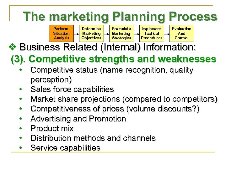 The marketing Planning Process Perform Situation Analysis Determine Marketing Objectives Formulate Marketing Strategies Implement Tactical Procedures Evaluation And Control v Business Related (Internal) Information: (3). Competitive strengths and weaknesses • Competitive status (name recognition, quality perception) • Sales force capabilities • Market share projections (compared to competitors) • Competitiveness of prices (volume discounts? ) • Advertising and Promotion • Product mix • Distribution methods and channels • Service capabilities