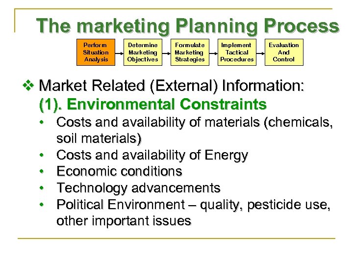 The marketing Planning Process Perform Situation Analysis Determine Marketing Objectives Formulate Marketing Strategies Implement Tactical Procedures Evaluation And Control v Market Related (External) Information: (1). Environmental Constraints • Costs and availability of materials (chemicals, soil materials) • Costs and availability of Energy • Economic conditions • Technology advancements • Political Environment – quality, pesticide use, other important issues