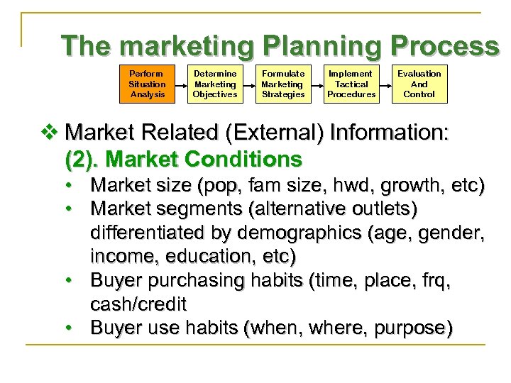 The marketing Planning Process Perform Situation Analysis Determine Marketing Objectives Formulate Marketing Strategies Implement Tactical Procedures Evaluation And Control v Market Related (External) Information: (2). Market Conditions • Market size (pop, fam size, hwd, growth, etc) • Market segments (alternative outlets) differentiated by demographics (age, gender, income, education, etc) • Buyer purchasing habits (time, place, frq, cash/credit • Buyer use habits (when, where, purpose)
