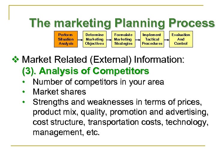 The marketing Planning Process Perform Situation Analysis Determine Marketing Objectives Formulate Marketing Strategies Implement Tactical Procedures Evaluation And Control v Market Related (External) Information: (3). Analysis of Competitors • • • Number of competitors in your area Market shares Strengths and weaknesses in terms of prices, product mix, quality, promotion and advertising, cost structure, transportation costs, technology, management, etc.