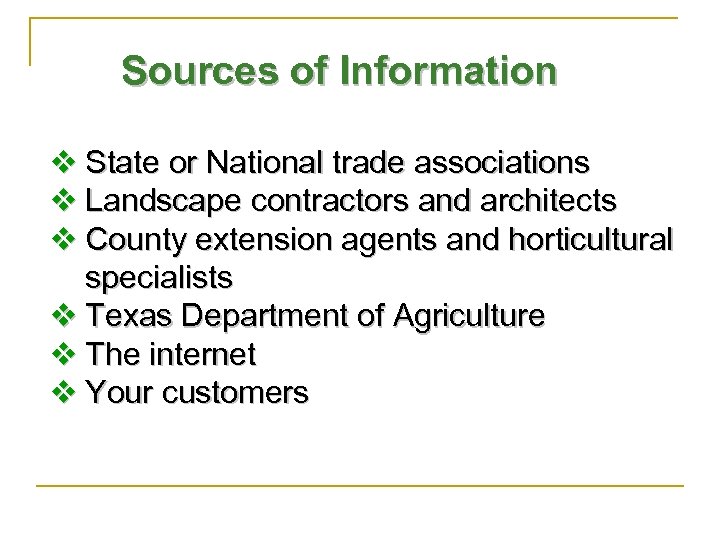 Sources of Information v State or National trade associations v Landscape contractors and architects v County extension agents and horticultural specialists v Texas Department of Agriculture v The internet v Your customers