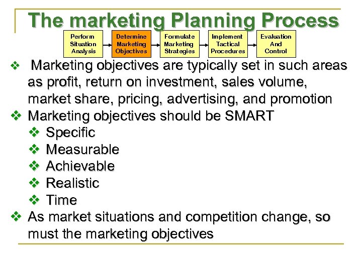 The marketing Planning Process Perform Situation Analysis Determine Marketing Objectives Formulate Marketing Strategies Implement Tactical Procedures Evaluation And Control v Marketing objectives are typically set in such areas as profit, return on investment, sales volume, market share, pricing, advertising, and promotion v Marketing objectives should be SMART v Specific v Measurable v Achievable v Realistic v Time v As market situations and competition change, so must the marketing objectives