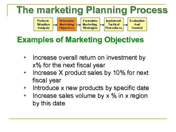 The marketing Planning Process Perform Situation Analysis Determine Marketing Objectives Formulate Marketing Strategies Implement Tactical Procedures Evaluation And Control Examples of Marketing Objectives • Increase overall return on investment by x% for the next fiscal year • Increase X product sales by 10% for next fiscal year • Introduce x new products by specific date • Increase sales volume by x % in x region by this date