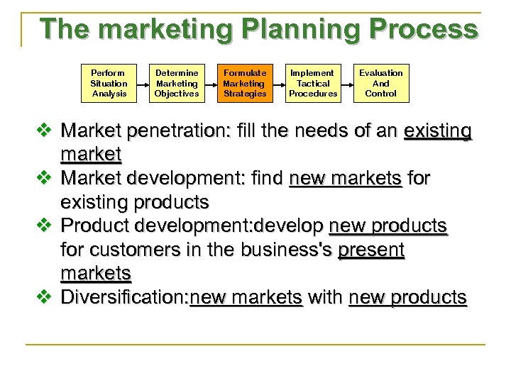 The marketing Planning Process Perform Situation Analysis Determine Marketing Objectives Formulate Marketing Strategies Implement Tactical Procedures Evaluation And Control v Market penetration: fill the needs of an existing market v Market development: find new markets for existing products v Product development: develop new products for customers in the business's present markets v Diversification: new markets with new products