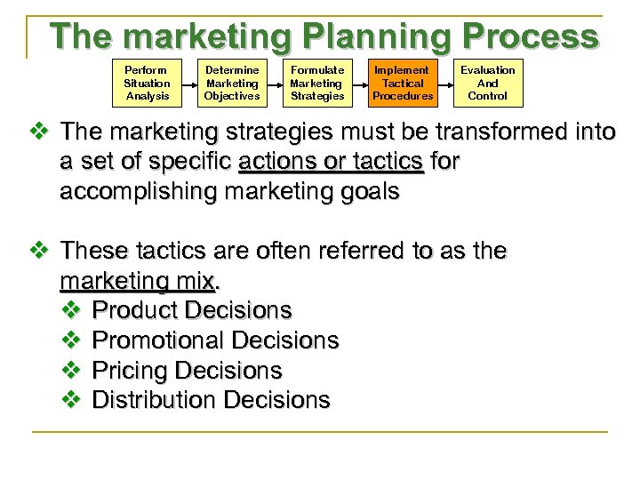 The marketing Planning Process Perform Situation Analysis Determine Marketing Objectives Formulate Marketing Strategies Implement Tactical Procedures Evaluation And Control v The marketing strategies must be transformed into a set of specific actions or tactics for accomplishing marketing goals v These tactics are often referred to as the marketing mix. v Product Decisions v Promotional Decisions v Pricing Decisions v Distribution Decisions