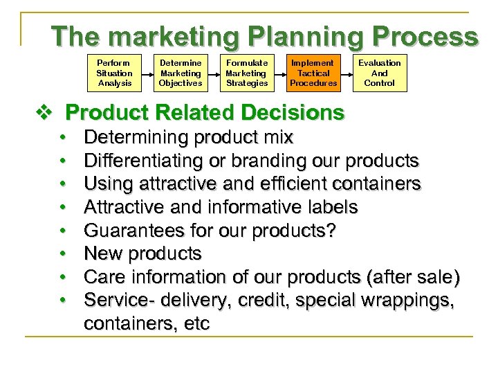 The marketing Planning Process Perform Situation Analysis Determine Marketing Objectives Formulate Marketing Strategies Implement Tactical Procedures Evaluation And Control v Product Related Decisions • • Determining product mix Differentiating or branding our products Using attractive and efficient containers Attractive and informative labels Guarantees for our products? New products Care information of our products (after sale) Service- delivery, credit, special wrappings, containers, etc
