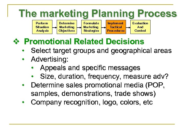 The marketing Planning Process Perform Situation Analysis Determine Marketing Objectives Formulate Marketing Strategies Implement Tactical Procedures Evaluation And Control v Promotional Related Decisions • Select target groups and geographical areas • Advertising: • Appeals and specific messages • Size, duration, frequency, measure adv? • Determine sales promotional media (POP, samples, demonstrations, trade shows) • Company recognition, logo, colors, etc