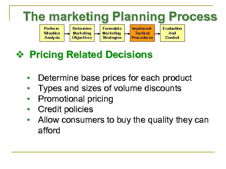 The marketing Planning Process Perform Situation Analysis Determine Marketing Objectives Formulate Marketing Strategies Implement Tactical Procedures Evaluation And Control v Pricing Related Decisions • • • Determine base prices for each product Types and sizes of volume discounts Promotional pricing Credit policies Allow consumers to buy the quality they can afford