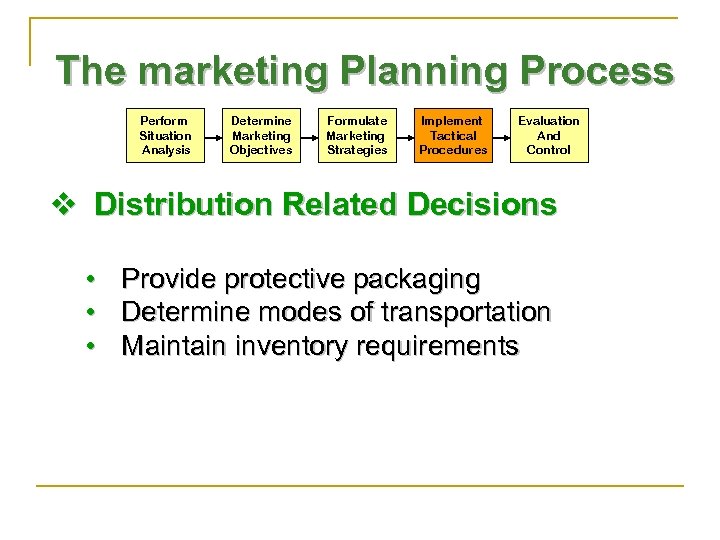 The marketing Planning Process Perform Situation Analysis Determine Marketing Objectives Formulate Marketing Strategies Implement Tactical Procedures Evaluation And Control v Distribution Related Decisions • • • Provide protective packaging Determine modes of transportation Maintain inventory requirements