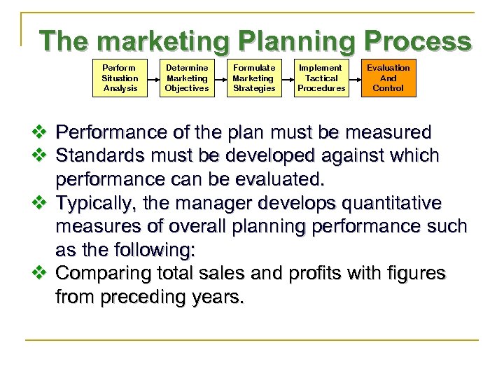 The marketing Planning Process Perform Situation Analysis Determine Marketing Objectives Formulate Marketing Strategies Implement Tactical Procedures Evaluation And Control v Performance of the plan must be measured v Standards must be developed against which performance can be evaluated. v Typically, the manager develops quantitative measures of overall planning performance such as the following: v Comparing total sales and profits with figures from preceding years.