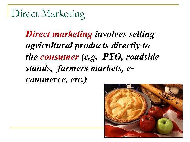 Direct Marketing Direct marketing involves selling agricultural products directly to the consumer (e. g. PYO, roadside stands, farmers markets, ecommerce, etc. )