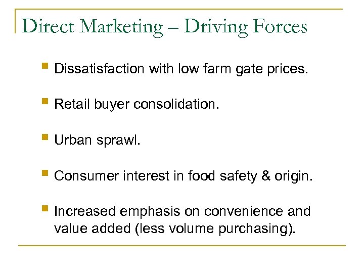Direct Marketing – Driving Forces § Dissatisfaction with low farm gate prices. § Retail buyer consolidation. § Urban sprawl. § Consumer interest in food safety & origin. § Increased emphasis on convenience and value added (less volume purchasing).
