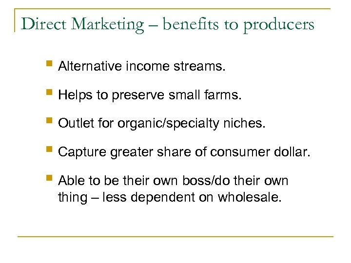 Direct Marketing – benefits to producers § Alternative income streams. § Helps to preserve small farms. § Outlet for organic/specialty niches. § Capture greater share of consumer dollar. § Able to be their own boss/do their own thing – less dependent on wholesale.