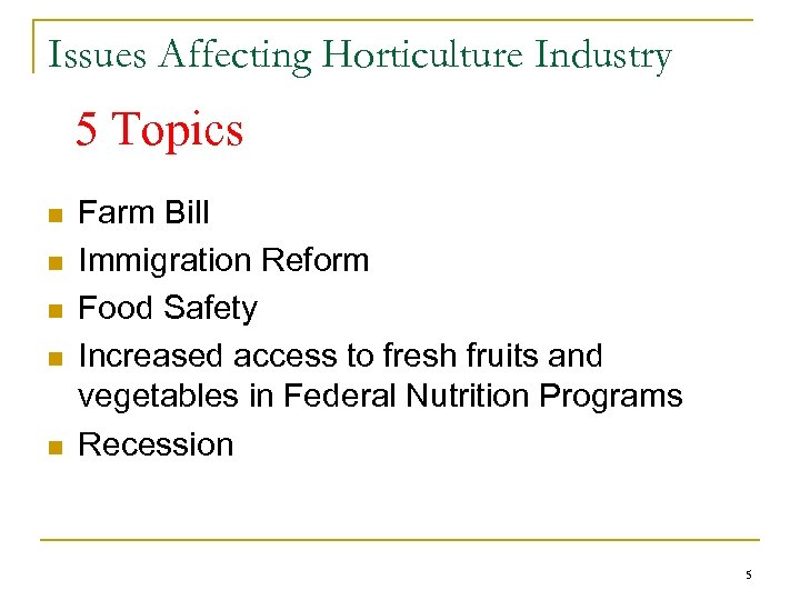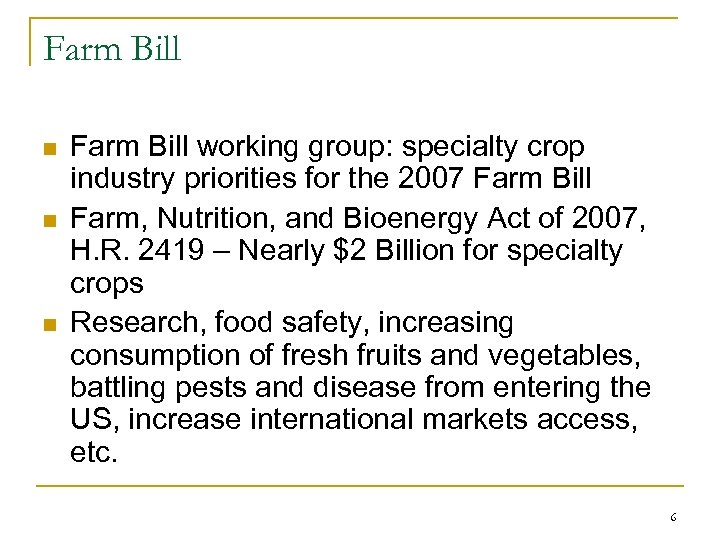 Issues Affecting Horticulture Industry 5 Topics n n n Farm Bill Immigration Reform Food Safety Increased access to fresh fruits and vegetables in Federal Nutrition Programs Recession 5