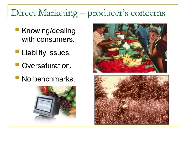 Direct Marketing – producer’s concerns § Knowing/dealing with consumers. § Liability issues. § Oversaturation. § No benchmarks.