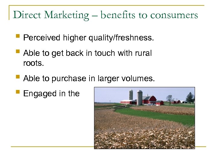 Direct Marketing – benefits to consumers § Perceived higher quality/freshness. § Able to get back in touch with rural roots. § Able to purchase in larger volumes. § Engaged in the “experience”.