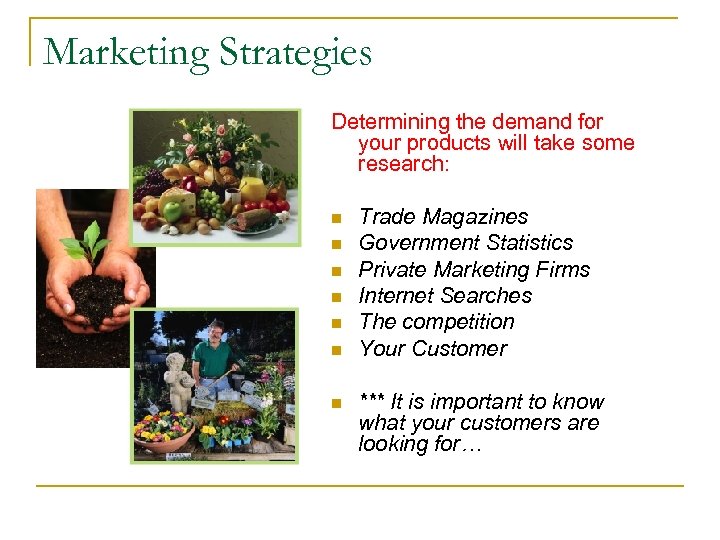 Marketing Strategies Determining the demand for your products will take some research: n n n n Trade Magazines Government Statistics Private Marketing Firms Internet Searches The competition Your Customer *** It is important to know what your customers are looking for…