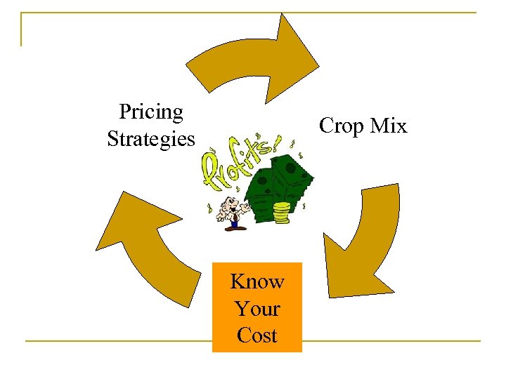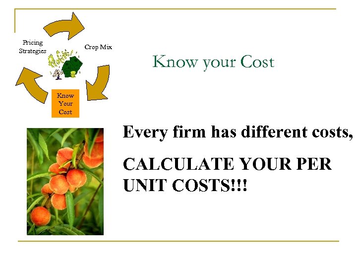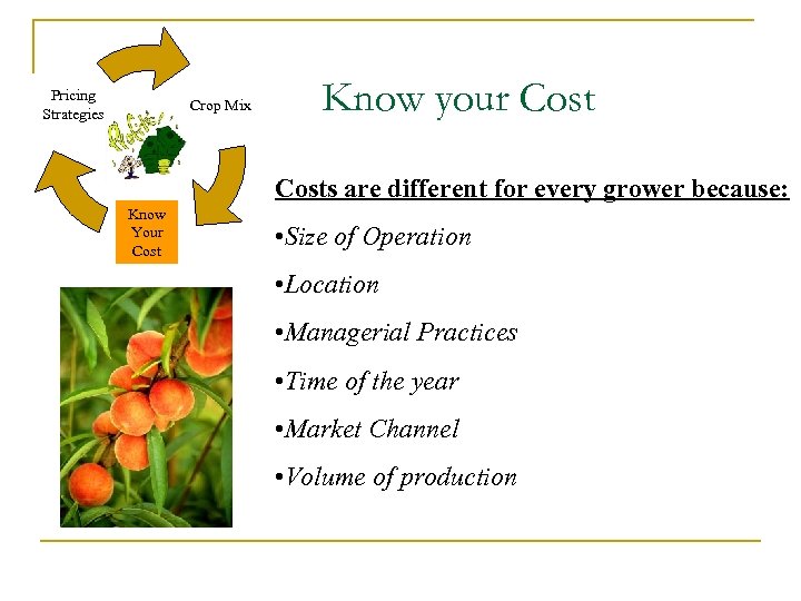 Pricing Strategies Crop Mix Know your Costs are different for every grower because: Know Your Cost • Size of Operation • Location • Managerial Practices • Time of the year • Market Channel • Volume of production