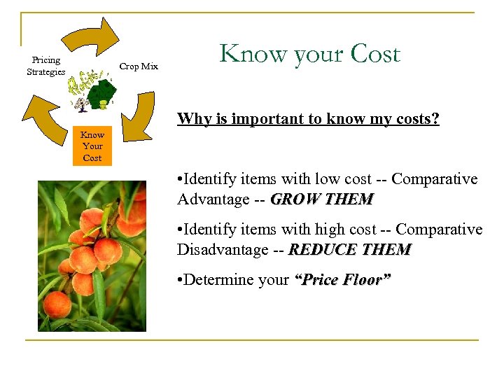 Pricing Strategies Crop Mix Know your Cost Why is important to know my costs? Know Your Cost • Identify items with low cost -- Comparative Advantage -- GROW THEM • Identify items with high cost -- Comparative Disadvantage -- REDUCE THEM • Determine your “Price Floor”